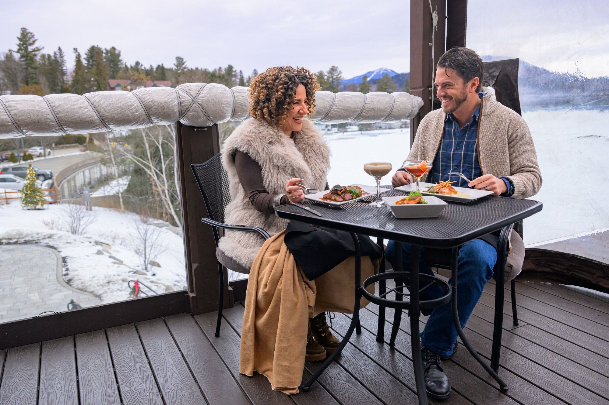 Winter's chill can't stop you from enjoying a warm, cozy, and totally romantic outdoor meal. Perched on a deck overlooking beautiful Mirror Lake, snuggle up next to one of Top of the Park's outdoor fire pit tables for a memorable meal. The plates are small, so they are perfect for sharing!